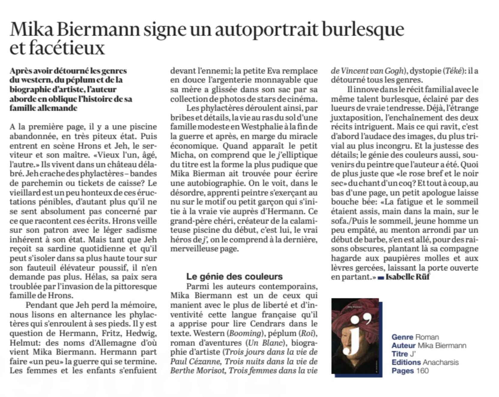"Tour de force de Mika Biermann ! Roman double, deux textes entrelacés, deux écritures en parallèle, entre rigueur et folie, l’une alignée et justifiée, l’autre, baroque, qui danse et caracole d’une ligne à l’autre ! L’une pour traduire le Roman familial dans l’Allemagne d’après guerre, avec sa part d’épopée, l’autre pour fêter l’imaginaire, dire l’amour des mots et des arts, servie par un personnage entre Groucho Marx et Don Quichotte ! Un régal !"